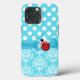 Turquesa encantadora e capas de iphone branca, com um fundo de turquesa e cor damasco branca, no fundo, e um padrão de bolinhas branca e turquesa, no topo. Gráficos de fita, atravessam o meio e são decorados com uma joaninha vermelha e preta. Personalizar para adicionar texto.