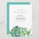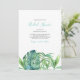 Este chá de panela de praia apresenta o nome da noiva, definido em uma tipografia de script manuscrito em na moda com detalhes de evento em uma serra de cinza de carvão clássico, se houver, em um fundo branco nítido. Uma réplica das minhas palmas de verde tropical de aquarela original e folhas de monstera em tons de verde turquesa adornam a frente. A carta de convite reverte para uma cor de turquesa de vidro marinho complementar. Uma chic costeira, mas elegante, para o almoço de luau de verão e para chás de panela à borbulha ou à lua. Para ver convites de casamento mais bonitos por Victoria Grigaliunas visite DotellABelle no Zazzle.