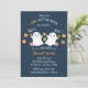 Um doce convite à chá de fraldas azul escuro com um tema de Halloween com dois adoráveis fantasmas. Projetado para pais que esperam gêmeos. Personalize-o com suas próprias informações usando o modelo. © ArianeC Ilustrações — Todos os direitos reservados