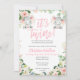 Convites para duche de elefantes super fofos para bebês gêmeos. Dois amendoins estão a caminho. Vamos comemora com um dia especial! As palavras "It's Twins!" estão escritas em uma letra de caligrafia rosa penteada. Estes convites apresentam flores cor-de-rosa pinceladas juntamente com um elefante bebê a balançar com elefante mamã. As imagens do elefante foram ilustradas por StarJamforKids