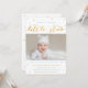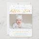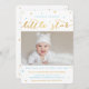 Primeiro convites de aniversário de uma estrela brilhante para um menino, com uma foto personalizada de um bebê e estrelas azuis e douradas sobre um simples fundo branco. "Torneira, pequena estrela cintilante, um ano é o que você é!" está em ouro e azul, com os detalhes da primeira festa de aniversário abaixo. Vocês podem as cartas como anúncios de primeiro aniversário também.