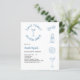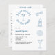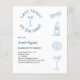 Um fundo branco. Decorado com ícones da costa azul. Personalize e adicione o nome da noiva a ser e os detalhes da festa. Texto: Última torrada na costa. Volta: itinerário do fim de semana. 1 folha = 1 convite impresso de borda a borda.