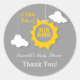Este adesivo de favor moderno e colorido é ideal para celebrar um Chá de fraldas com um Sol, "Você é meu Sol", "Meu Pequeno Sol" ou tema "Um Pequeno Raio de Sol". Ele apresenta um sol cortado com nuvens bonitas penduradas no topo de uma cinza de fundo. Esta design é excelente para o verão e para todo o ano. Design Unisex. Design colorida e divertida que uma mãe chique apreciará.
