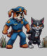Um cão da polícia captura um gato perigoso, design humorístico para oferecer aos seus amigos, crianças e a todos aqueles que amam animais.