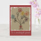 Um cartão de aniversário encantador com o meu design floral de mídia mista original com uma pintura infantil de cinco flores simples, de cinco pétalas - cada uma com uma cor diferente: um azul aqua, um vermelho profundo, um ouro amarelo laranja e um violeta. Cada flor tem um caule representado por uma linha de solteiro com duas folhas e o buquê é amarrado com um pequeno arco de fio vermelho. O fundo da pintura tem bordas ásperas e um fazer de aspecto marrom e envelhecido que ela sente como se tivesse sido pintada há muito tempo. Eu criei este cartão totalmente personalizável como um cartão de aniversário, mas também seria apropriado para muitas ocasiões diferentes ou apenas para quando você quer enviar um sorriso para alguém.