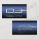 Um modelo legal do cartão de negócios do DJ com um design impressionante de lasers azuis no céu nocturno combinou com as notas pretas da música do luminoso em um fundo escuro.
