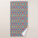 Um conjunto de toalha e paninho colorido com um padrão geométrico vibrante de rosa, azul, amarelo e laranja. O design é simétrico e atraente.