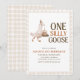 Um modelo de convite de primeiro aniversário de um ganso bobo editável Celebre o primeiro aniversário do seu pequeno com este adorável convite "Um ganso bobo"! Com um ganso desenhado à mão encantador carregando um bolo de aniversário, este convite de tons neutros é perfeito para uma festa de primeiro aniversário divertida e caprichosa.
