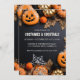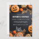 Uma festeira assustadora do Halloween convocando um design com um crânio detalhado como elemento central, rodeado por estranhos motivos de outono e tons atmosféricos escuros. O convite define a palco de um **Cocktails & Costumes Party**, enfatizando a elegância assustadora com um toque de mistério. Perfeito para os convidados ansiosos por uma noite de bebidas assombrantes, fantasias criativas e diversão de espinha.