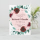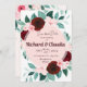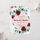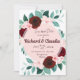O convite é caracterizado por um fundo cor-de-rosa transparente e pelo quadro de flores vermelhas escuras e flores cor-de-rosa e decorado com folhas verdes de plantas e linha geométrica elegante para acrescentar um olhar elegante e geométrico ao tema do casamento