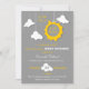 Este convite moderno e colorido é ideal para celebrar um Chá de fraldas com um tema Sol, "Você é meu Sol", "Meu Pequeno Sol" ou "Um Pequeno Raio de Sol". Ele apresenta um sol cortado com nuvens bonitas penduradas no topo de uma cinza de fundo. Esta design é excelente para o verão e para todo o ano. Design Unisex. Design colorida e divertida que uma mãe chique apreciará.