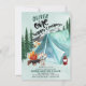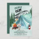 Acampamento no primeiro aniversario - perfeito para um churrasco de quintal, piquenique ou festa de aniversário ao ar livre. Esta design de aquarela tem uma montanha e uma paisagem florestal com tenda, fogueira e fungos. O título diz "[name] is one Happy Camper" (nome] é uma camper feliz) e o texto restante do convite é totalmente editável.