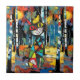 Um gato branco com aparência geométrica, de vidro manchado se encontra em uma floresta vibrante de pássaros. O fundo apresenta uma mistura colorida de folhas de outono e tons de azul e amarelo. Fotografia de Arte Digital