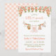 Bem-vinda à sua pequena princesa com estilo com nosso convite de chá de bebê doce pêssego. Este convite apresenta pêssegos em aquarela, flores e roupas de bebê em uma corda de roupa. O tema perfeito para um chá de bebê inspirado na primavera ou verão.