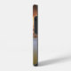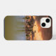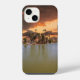 um dramático pôr do sol no Parque Encanto com um lago cercado por palmeiras verdes e peludas na Arizona de Phoenix.