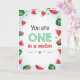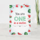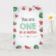 "Você é um em uma melancia" cartão de cumprimentos dobrável fofo. Personalize o texto interno ou remova-o completamente e escreva sua própria mensagem pessoal à mão. Itens correspondentes podem ser encontrados em nossa Coleção de Festa de Melancia.
