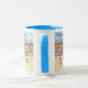 Uma caneca azul bonito da campainha para amantes do bokk com a ilustração de um pinguim esperto que lê um livro em uma cadeira confortável e as palavras "uma não pode ter livros demais" escritos ordenadamente em letras azuis na parte superior.