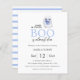 Simples e moderno convite para o chá de fraldas de Halloween com um fantasma bonito segurando uma abóbora bebê em um fundo branco limpo. Com as palavras " um pouco de bu está quase a chegar " e estrias azul pastel e branco para trás. Pronto para uma personalização fácil.