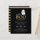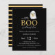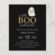Simples e moderno convite para o Chá de fraldas de Halloween com um fantasma bonito segurando uma abóbora bebê em um fundo preto. Com as palavras " um pouco de bu está quase a chegar " e estrias laranja pastel e preto para trás. Pronto para uma personalização fácil.