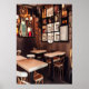 Dentro um pequeno café, mesa, cadeiras e decoração na parede. Esta é uma arte gerada por IA.