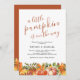 Convites para bebês russos no outono, com um simples fundo branco, folhas elegantes de aquarela e abóboras, e um modelo moderno de "um pequeno abóbora está a caminho" que é fácil de personalizar.