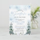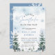 Um pequeno floco de neve está no caminho convite para o Chá de fraldas com flocos de neve azuis e pinheiros, e boho design.