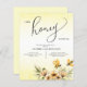 O Convite A Little Honey Bee Chá de fraldas é uma forma doce e encantadora de celebrar a futura mãe. Apresentando adoráveis sotaques de abelha de mel com detalhes amarelos e negros suaves, ele define o tema perfeito para uma celebração zangada. A frase brincalhona "A Little Honey Bee" adiciona um toque caprichoso que os hóspedes vão amar. Impresso em estoque de cartão de alta qualidade, ele garante durabilidade e aparência polida. O layout limpo fornece amplo espaço para compartilhar detalhes importantes como data, hora e local. Seu design alegre combina lindamente com chás de fraldas rústicos, jardineiros ou inspirados na natureza. Perfeito para encontros internos e externos, cria um sentimento quente e convidativo. Um convite encantador que dá o tom para um chá de fraldas alegre e memorável.