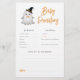 Este design apresenta um pequeno fantasma de aquarela que veste o chapéu e a gravata do arco de um bruxo. Um tema fofo de chá de fraldas de outubro. Um cartão de jogo de predições e conselhos para bebês que combina com o nosso design de "Um Pequeno Chá de fraldas de Halloween". Veja a coleção vinculada nesta página para itens correspondentes ou visite nossa loja para mais designs de chá de fraldas halloween.