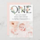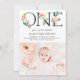 Um Pêssego Floraliza Primeiro Convite Fotográfico de Aniversário. Primeiro convite de aniversário elegante e feminino com uma tipografia com pêssego aquoso e flores de marfim e folhagem. Este convite de 1º aniversário para fotos de pêssego é perfeito para festas de aniversário neutras em termos de gênero.