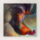 Uma pintura de galo cativante que retrata a personalidade viva de um galo, onde um galo majestoso com um pente vermelho brilhante, depilando penas, e olhos afiados atinge uma pose esplêndida, enquanto o fundo se torna uma maravilha fantástica de cores giratórias e elementos imaginativos.