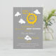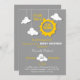 Este convite moderno e colorido é ideal comemorar um chá de fraldas com uma luz do sol, "você é minha luz do sol", "minha pouca luz do sol" ou "um raio tema da luz do sol pequeno". Caracteriza um sol cortado com as nuvens bonitos que penduram da parte superior em um fundo cinzento. Este design é grande para o verão e durante todo o ano. Design unisex. Design colorido e brincalhão que uma mamã chique apreciará.