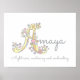 Bonito Um nome de arte de monograma poster perfeito para um quarto ou sala de jogos para meninas em tons de cinza, branco, amarelo, rosa e roxo. Personalize com o próprio nome do seu filho começando com A, e o nome que significa um toque verdadeiramente personalizado no quarto ou no berçário do seu filho, este exemplo é para o nome A Amaya Night rain, berçária e encantadora. Impressão de poster bonitinho ideal para um novo bebê, batizar ou dom de chá de fraldas. © Único Um monograma de corações e flores desenho descrição e design de arte gráfica por Sarah Trett. www.sarahtrett.com para www.mylittleeden.com