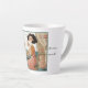 Uma caneca de chá em café com leite em estilo retrô, com uma mulher apaixonada pelo chá, saboreando seu chá, dois gatos próximos, cortinas de rendas com um ditado insensível para os entusiastas do chá.