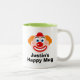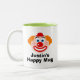 A caneca de criança costume alegre com um rosto de palhaço feliz. Um mímico bonito desenhando com nariz vermelho e chapéu engraçado. Personalize com o nome da criança. Divertido para rapazes e raparigas. Escolha uma cor personalizada no dentro.