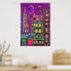 Uma cidade estranha e colorida com um monte de céu roxo, roxo, lua roxa, um arranha-céu estranho. Uma arte estranha única. Esta é uma arte gerada por IA.