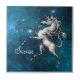 Uma bela ilustração de unicórnio no estilo heráldico vintage, colocada sobre o fundo do céu celeste. Personalizar com o nome ou outro texto na fonte do script branco.