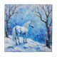 Uma cena de sonho captura um unicórnio num momento de silenciosa contemplação em meio a uma leve queda de neve. As cores primárias são azuis legal, brancos gelados e sussurros de prata. O unicórnio, com seu mano e cauda fluidos, é representado com pigmento ligeiramente mais forte para se destacar, enquanto a neve caindo é criada por pequenas e delicadas marcas brancas de resguardo e lavagens mais leves. O chão é uma mistura de sombras brancas e azuis suaves e esmaecidas, com ramos de árvore negras aparecendo como linhas suaves e borradas no fundo, somando-se ao humor tranquilo e etéreo. O efeito geral é delicado e quase cristalino, perfeito para um espaço interior calmo.