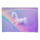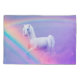 Unicórnio branco, arco-íris e céu roxo com nuvens cor-de-rosa.