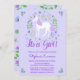Este convite para chá de fraldas apresenta um design unicórnio floral bonito com elementos faux roxos de brilho. Há um padrão atrás. Personalize-o com seus detalhes.