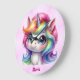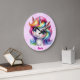 Rosto unicórnio bonito e feliz e cor do cabelo arco-íris impressa em uma placa de relógio com nome