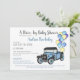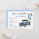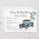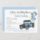 Caminhão antigo estilo personagem em azul claro com um cheio de camionete de balões dirigindo por convite para chá de fraldas. Personalize o texto como preferido.