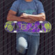 Um skate elegante e cristão desenhado. Possui o nome de Jesus em um design urbano.