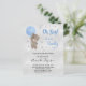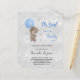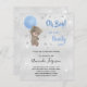 Para um chá de fraldas celebrando um menino. Um fundo metálico falso prateado. Um ursinho de pelúcia segurando estrelas de balões azuis e poeira brilhante fraca. Personalize e adicione o nome da mãe a ser e os detalhes da festa. O nome e o texto: Oh Boy! e Barly são escritos com um estilo escrito à mão.