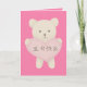 O cartão de aniversário é feito com um urso fofo abraçando um grande coração com "Parabéns" em texto chinês.