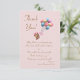 O design de Cartões de agradecimentos plano do tema Urso bonito e balões é a maneira perfeita de obrigado dos seus convidados depois do seu chá de fraldas. Design apresenta a adorável imagem de um ursinho de pelúcia fofinho vestindo um arco rosa e segurando em um monte de balões. As palavras "Obrigado!" são exibidas em letras decorativas no canto superior esquerdo. Abaixo da imagem, seu texto personalizável é exibido em letras douradas. Projetado para coordenar com os convites e acessórios do Cute Bear e dos Balões Temidos.
