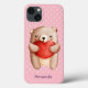 Uma capa de telefone com uma ilustração de aquarela fofa. Um ursinho castanho carregando um grande coração vermelho. Bolinhas amarelas claras em fundo rosa.