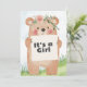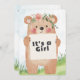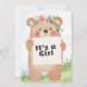 Celebre em estilo com este adorável convite de chá de fraldas com uma ilustração de urso bonitinho segurando um cartaz que diz "É uma Rapariga." O verso inclui todos os detalhes do evento com um fundo verde e azul macio e um título com tema de urso lúdico. Perfeito para florestas ou chás de fraldas de animais!