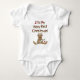 Um texto em estilo infantil, listrado, de cana-de-açúcar, que diz "É o meu primeiro Natal!" e um ursinho de pelúcia vestido com galhadas de renas são apresentados nas primeiras T-shirts, fatos e sacos de tote de Natal de um bebê.