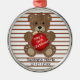 Comemore o primeiro feriado do bebê com este adorável ursinho de pelúcia, ornamento cerâmico. Colocado contra um fundo listrado de cana doce é este urso fofinho marrom. O urso está segurando ornamento vermelho que diz "O Primeiro Natal do Bebê". Você pode personalizar este texto. Embaixo do urso há uma área para um nome e uma data.