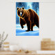 Um urso marrom na neve com uma floresta ao fundo. Esta é uma arte gerada por IA.